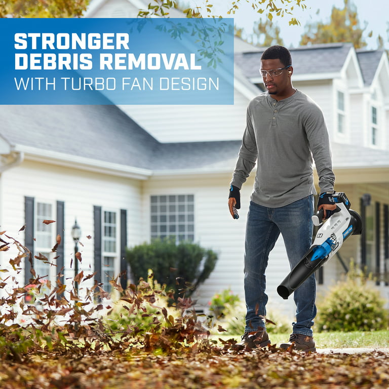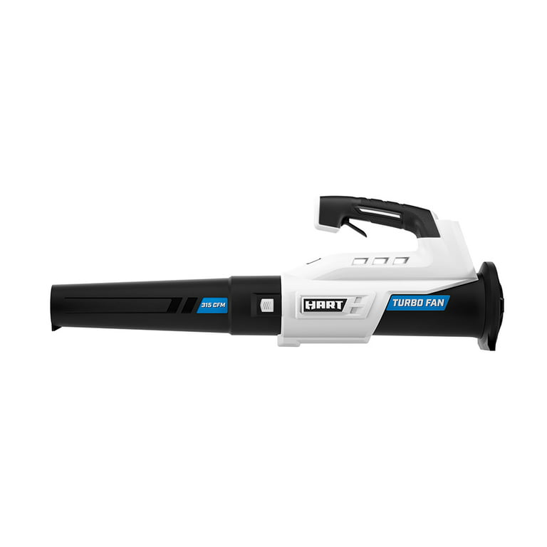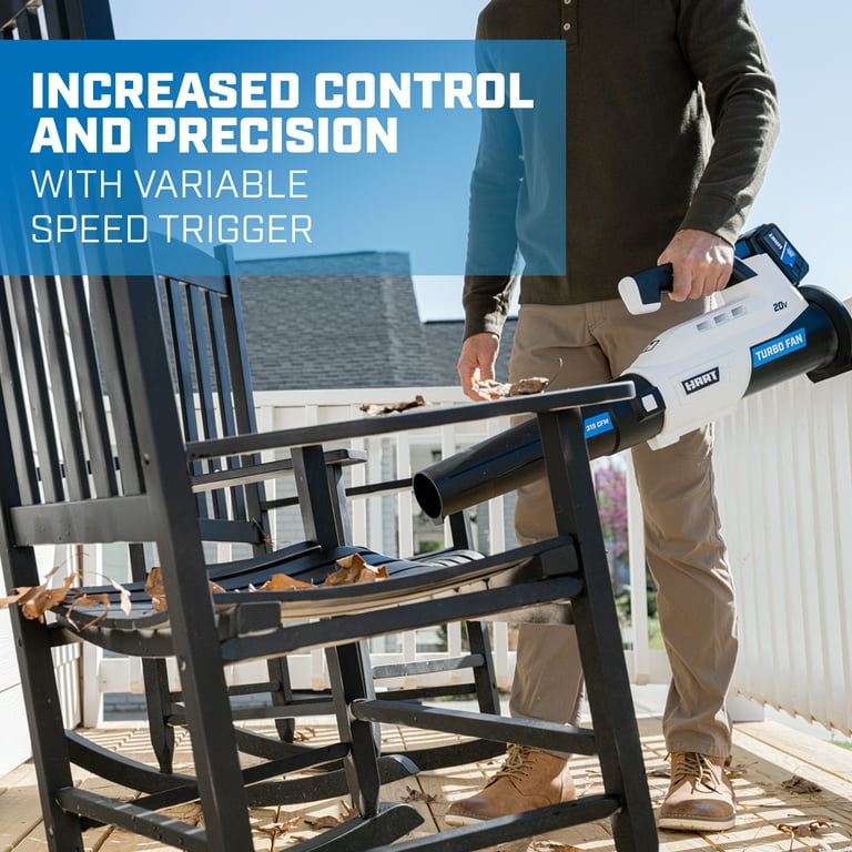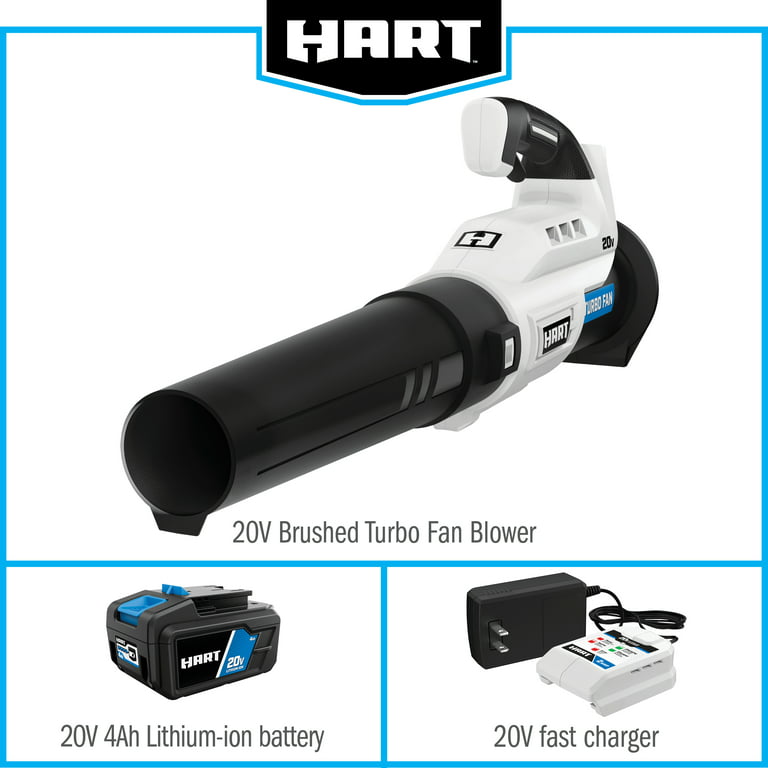 Ditch the garden rake, it’s time to upgrade to the HART 20V Turbo Fan Blower. With the innovative turbo fan design that maximizes air velocity and delivers twice the clearing power, this cordless blower is a powerful tool to have in your tool shed. It provides 315 CFM and 100 MPH of power for stronger debris removal from your yard. And for large yards, the variable speed trigger provides more user control, from maximum clearing power to more focused blowing. The included 20V battery is compatible with all HART 20V tools. Includes: Turbo Fan Blower, blower tube, 4.0Ah Lithium-ion battery, fast charger and operator’s manuals.